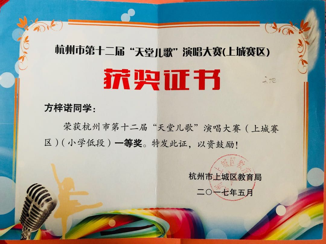 方梓诺天堂儿歌一等奖杭州海宏音艺术