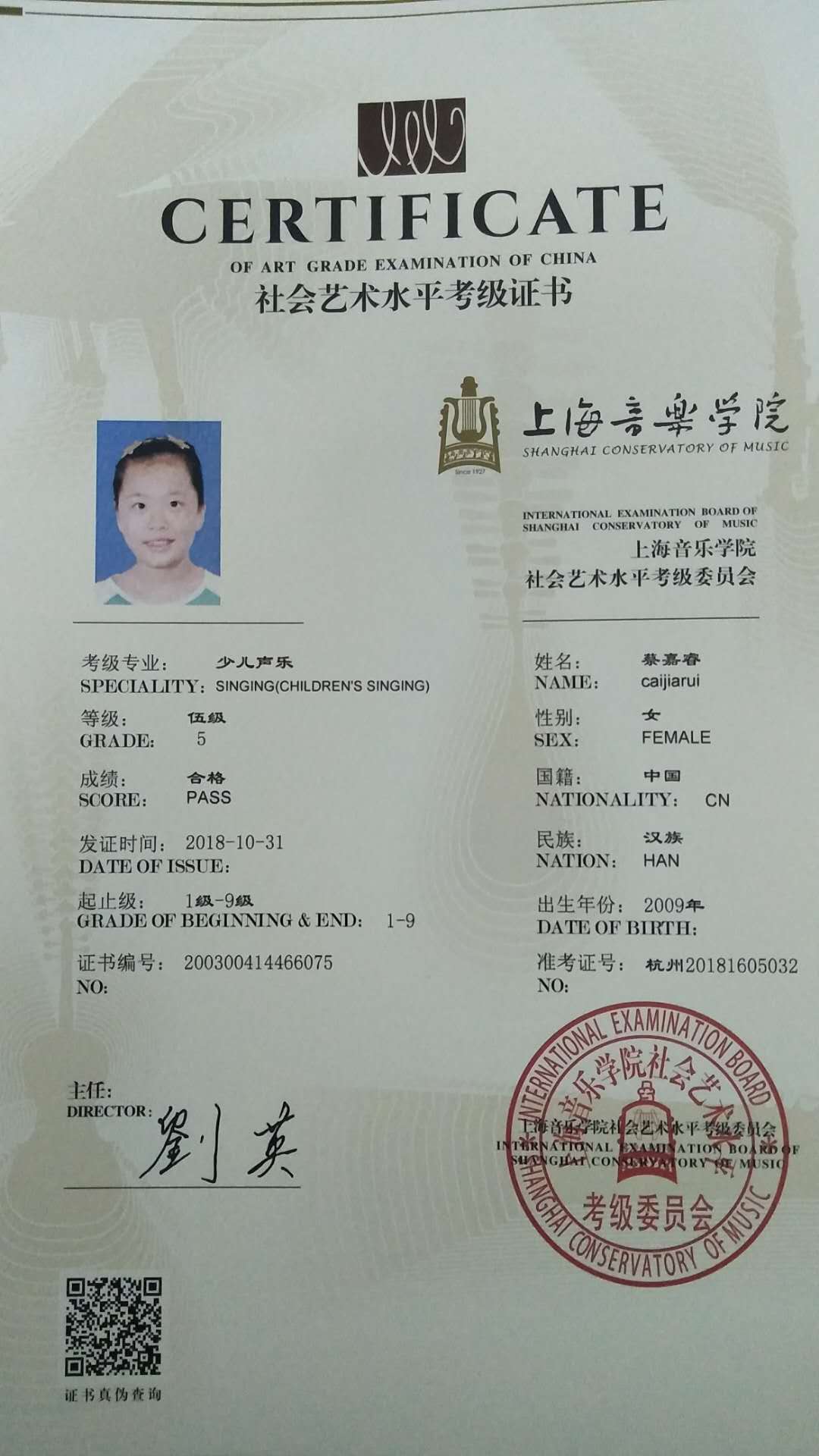 蔡嘉睿上海音乐学院五级考级杭州海宏音艺术