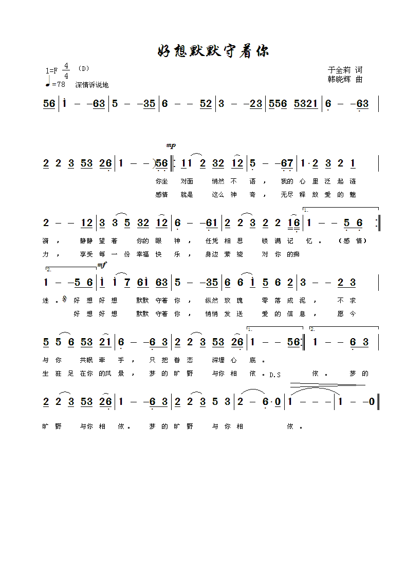 好想默默守着你-简谱