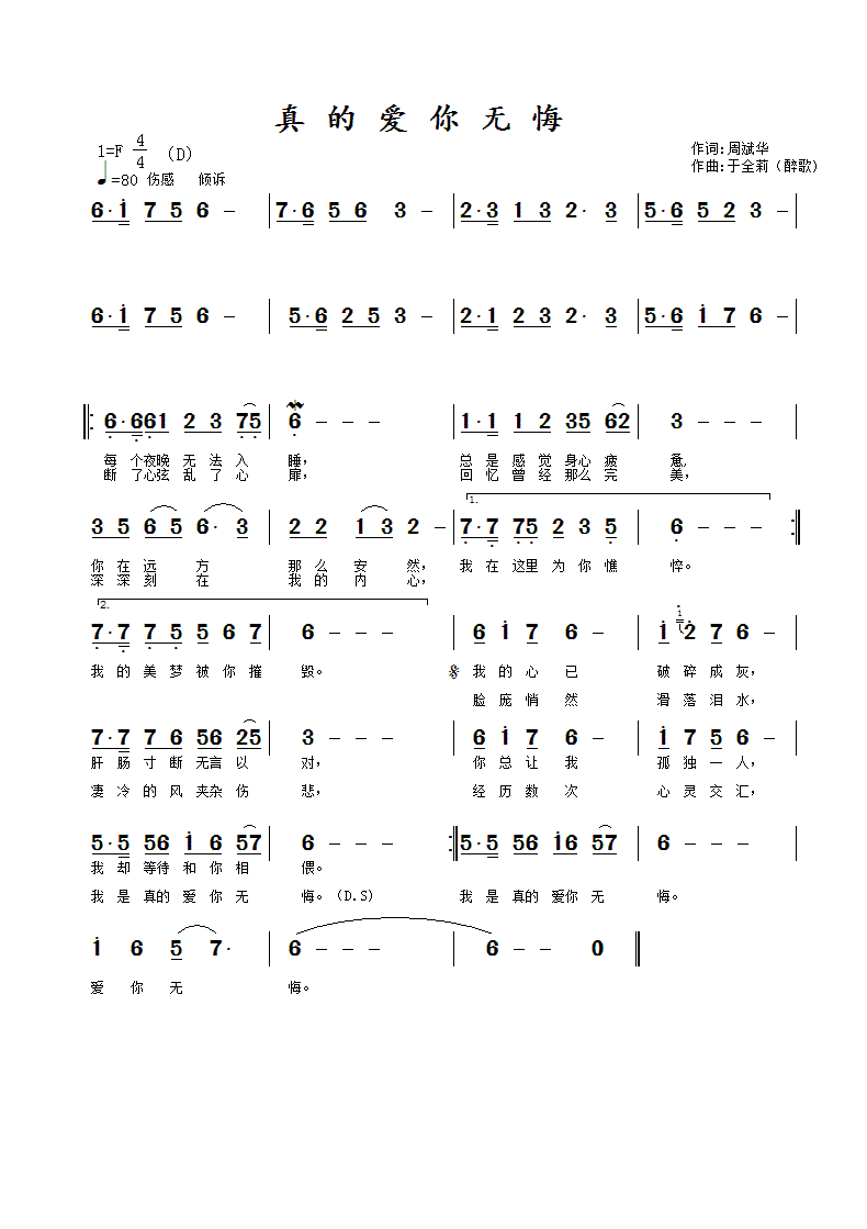 真的爱你无悔-简谱