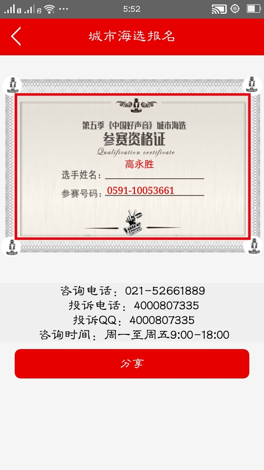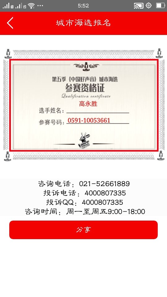 朗坤福州中国好声音参赛资格证2016-03-12