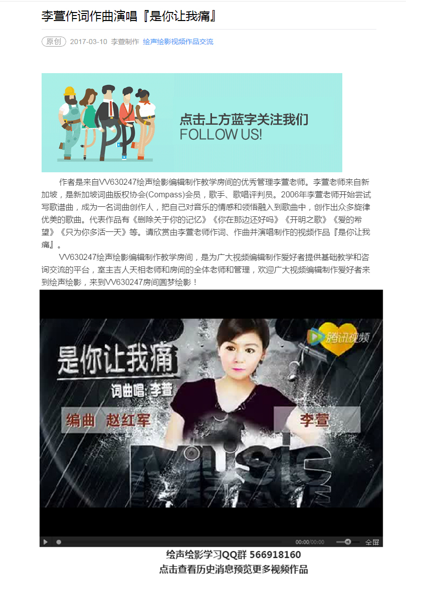 作者是来自VV视频社区VV630247绘声绘影编辑制作教学房间的优秀管理李萱老师。李萱老师来自新加坡,是新加坡词曲版权协会(Compass)会员,歌手、歌唱评判员。2006年李萱老师开始尝试写歌谱曲,成为一名词曲创作人,把自己对音乐的情感和领悟融入到歌曲中,创作出众多旋律优美的歌曲。代表作品有《删除关于你的记忆》《你在那边还好吗》《开明之歌》《爱的希望》《只为你多活一天》等。请欣赏由李萱老师作词、作曲并演唱制作的视频作品『是你让我痛』。