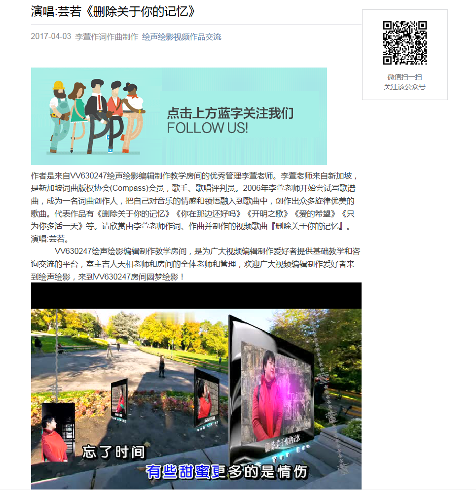 作者是来自VV视频社区VV630247绘声绘影编辑制作教学房间的优秀管理李萱老师。李萱老师来自新加坡,是新加坡词曲版权协会(Compass)会员,歌手、歌唱评判员。2006年李萱老师开始尝试写歌谱曲,成为一名词曲创作人,把自己对音乐的情感和领悟融入到歌曲中,创作出众多旋律优美的歌曲。代表作品有《删除关于你的记忆》《你在那边还好吗》《开明之歌》《爱的希望》《只为你多活一天》等。请欣赏由李萱老师作词、作曲并制作的视频歌曲『删除关于你的记忆』。演唱:芸若。